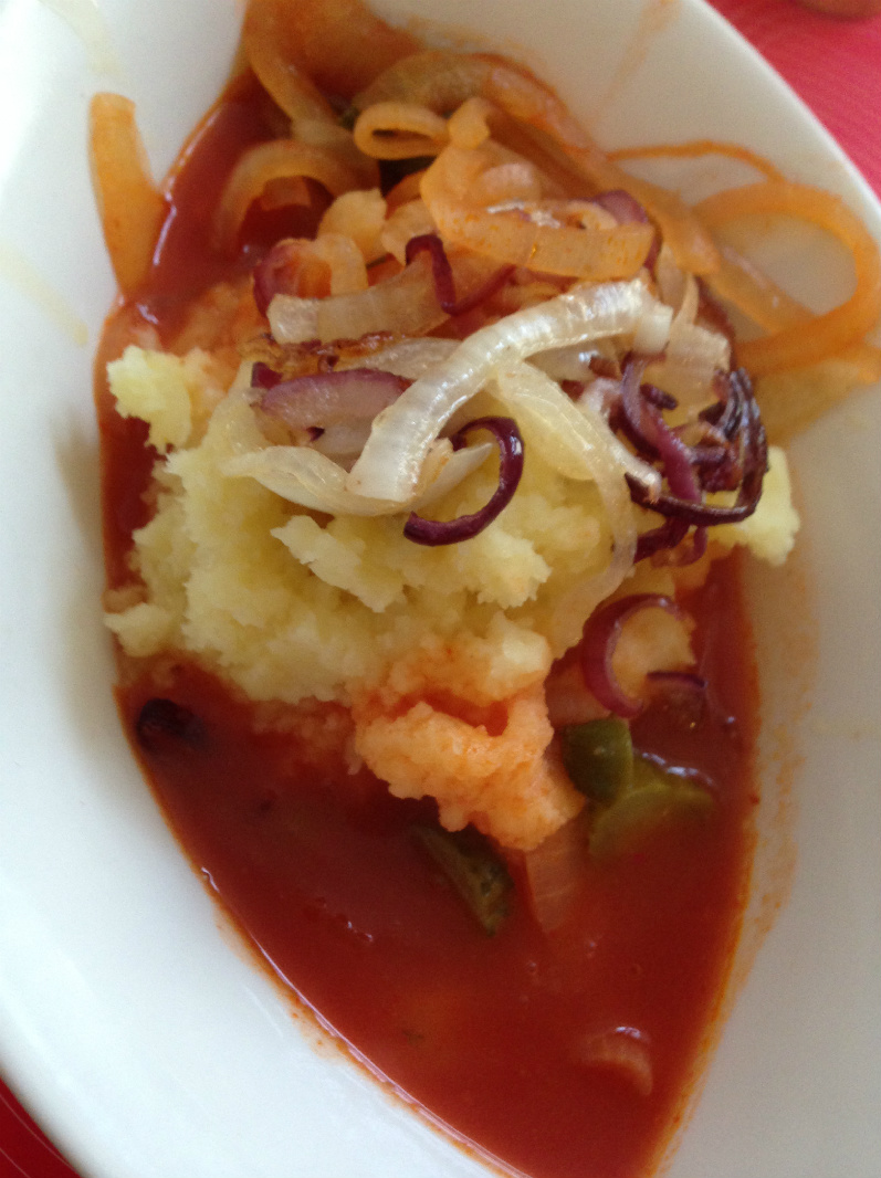 Meine Mutti hat meiner Familie bereits seit ich ein kleines Mädchen war Würstchengulasch mit Kartoffelbrei zubereitet. Die Süße, gleichzeitige Würze und seine als Kraken-geschnittenen Würstchen zeichneten das Würstchengulasch aus. Nachdem ich auf Fleisch und andere Tierprodukte verzichte, probierte ich es einfach ohne Würstchen aus und es schmeckt!
