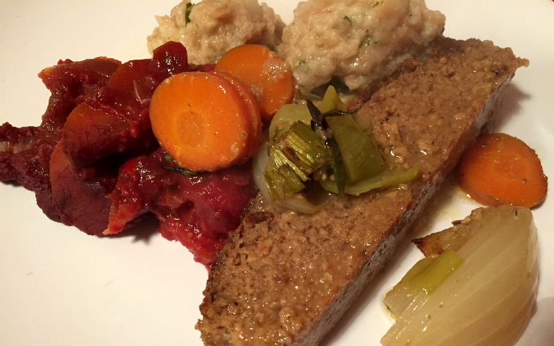 Meine Freunde waren begeistert und betitelten den Braten als echten „Falschen Hasen“. Dazu habe ich ein kräftiges Ragout mit Porree, Möhren und Tomaten zubereitet.